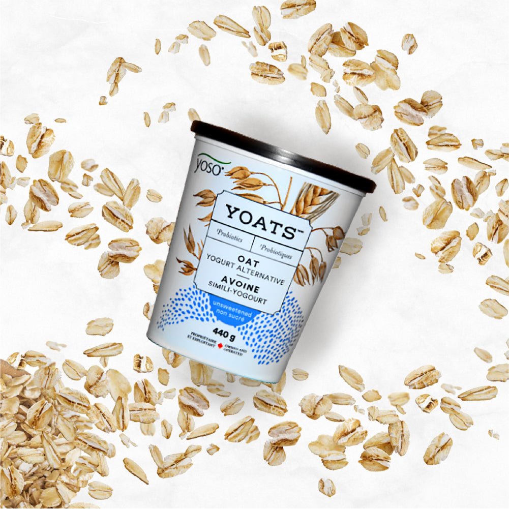 YOSO YOATS Yogurt was the first oat yogurt line in Canada. Offered in an unsweetened plain, unsweetened vanilla, and also the first unsweetened blueberry flavour for plant-based yogurts.
