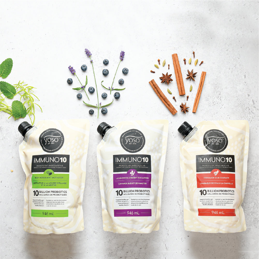 YOSO Smoothies are the first plant-based high probiotic smoothie with 10 billion probiotics per serving, and paired with functional ingredients. When the IMMUNO10 Probiotic Smoothie line was launched it was offered in five interesting flavours: Unsweetened Minimalist, Vanilla Guarding Angel, Strawberry Overachiever, Lavender & Blueberry Zen Master, Cinnamon Chai Charmer and Irish Moss & Mint Motivator.